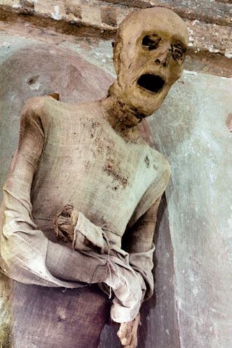 Of the three lectures I saw Paul give, the one which fascinated me most (blogging as I do about sex and death and any possible links) was his romp through the world of Sicilian sex ghosts at Blacks in Soho. I can’t give too much away, since all this is Paul’s research, but for one of his new books he visited several Capuchin Catacombs in Palermo, Sicily which began mummifying their dead in 1599. Initially this mummification was for the clergy only, but eventually nobles and others who could afford it would pay to be ’embalmed’ in a rudimentary way and remain in the vaults. The procedure was basic at first as can be seen in the first three mummies below, but eventually improved enough to create “The Sleeping Beauty” Rosalia Lombardo in 1920.