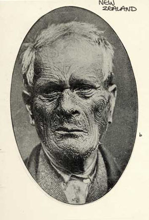 Priests were exempt from the tattoo, and slaves were forbidden – at first. The whole purpose of the moko was identification of a Maori warrior’s head if it was cut off by the enemy in battle, and also to distinguish a noble or freeman from a slave. To this end the patterns on the faces, consisting of spirals which were symmetrical, still differed from one man to the other. However, the spiral pattern on the buttocks was always the same. The deep tortuous lines of moko added fierceness to the features and in order to show it off to its best advantage beards and facial hair were forbidden. In fact, rather than shaving, the men had to submit to having their beard hair pulled out by the roots too.