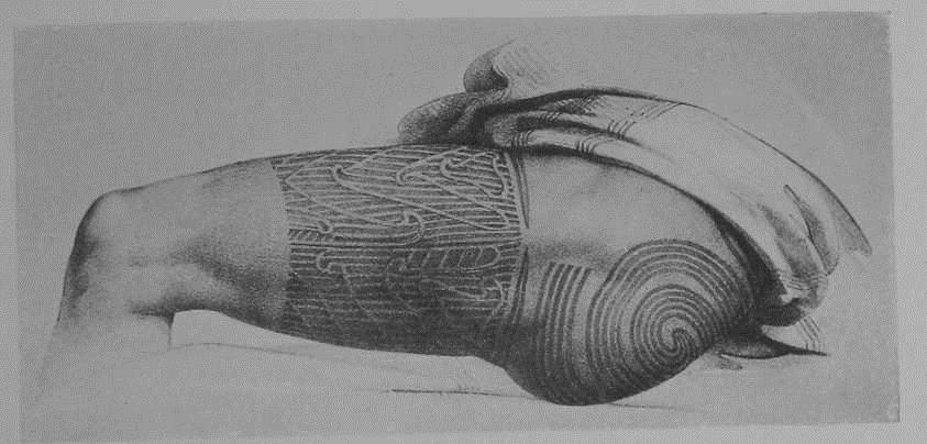 The patterns were dependant on the wearer: In males, the chiefs had their faces and bodies covered with designs, and although the other men were usually tattooed on the face, hips and body (as low down as the knees) they were not allowed to be decorated on the forehead, upper lip or chin as those spaces were solely reserved for the “great ones of the tribe”. Women also received certain marks of the moko, mainly on the lips and chin but sometimes on either side of the nose. It was considered attractive for Maori women to have blue lips, rather than red which was “looked on as a reproach or disfigurement”.